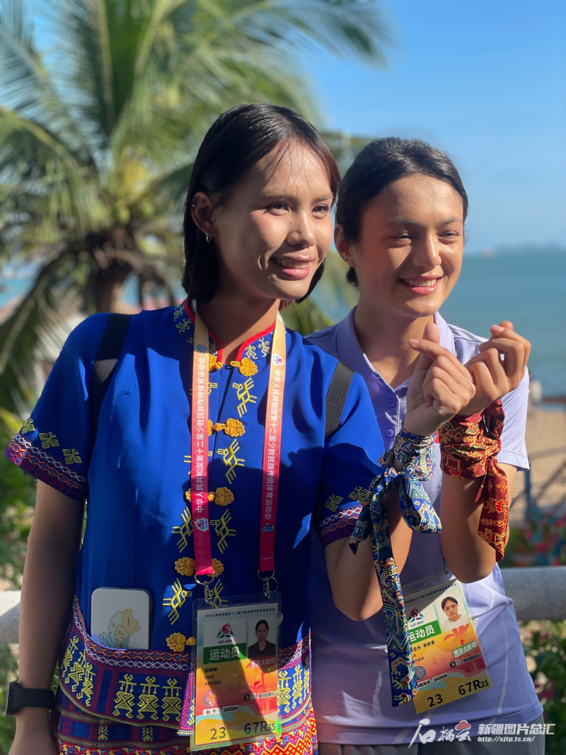 游園期間,新疆代表團(tuán)運(yùn)動員和海南代表團(tuán)運(yùn)動員開展了結(jié)對活動。互贈禮物時,新疆代表團(tuán)的運(yùn)動員們準(zhǔn)備了駱駝玩偶,海南代表團(tuán)的運(yùn)動員們送上了貝殼相框,并給新疆代表團(tuán)的運(yùn)動員們系上了當(dāng)?shù)靥厣氖掷K,為他們加油?!皻g迎大家來我們大美新疆游玩?!毙陆\(yùn)動員茹克亞木·奧斯曼向大家發(fā)出熱情邀約。