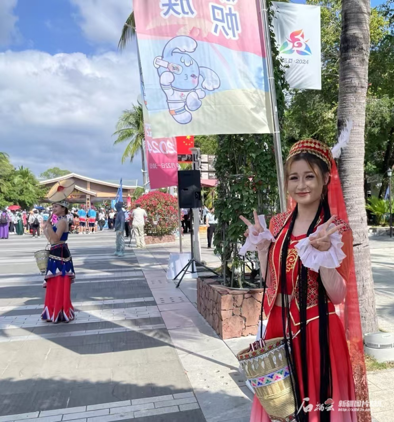 歡迎儀式的人群中,一頭麻花辮的艾麗非熱·艾爾肯非常引人注意,很多運(yùn)動員前去與她合影,“我們排練一個月了,我要用最好的狀態(tài)為運(yùn)動員加油,今天看見了很多家鄉(xiāng)的運(yùn)動員,特別激動,等我表演完就去找他們合影?!卑惙菬峤榻B,她家在新疆阿克蘇,在三亞理工職業(yè)學(xué)院上大二,這幾天每天都在關(guān)注運(yùn)動會的各類信息。