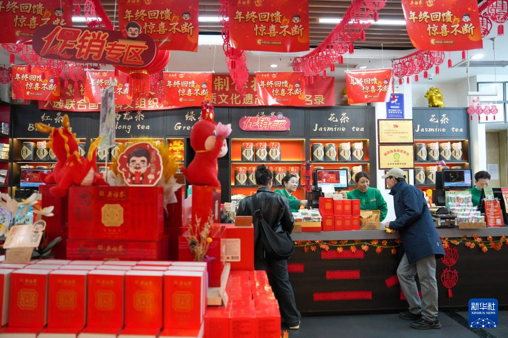 在位于北京前門大街的吳裕泰茶莊,工作人員(左一)將茶餅干遞到顧客手中(11月15日攝)。新華社記者 鞠煥宗 攝