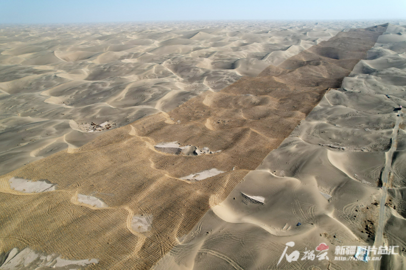 11月28日,俯瞰位于葉城縣洛克鄉(xiāng)國道北側(cè)鎖邊空白區(qū)連片的防沙網(wǎng)格。