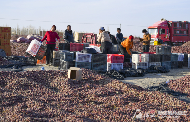 11月29日,策勒縣農(nóng)民在晾曬場(chǎng)搬運(yùn)紅棗。