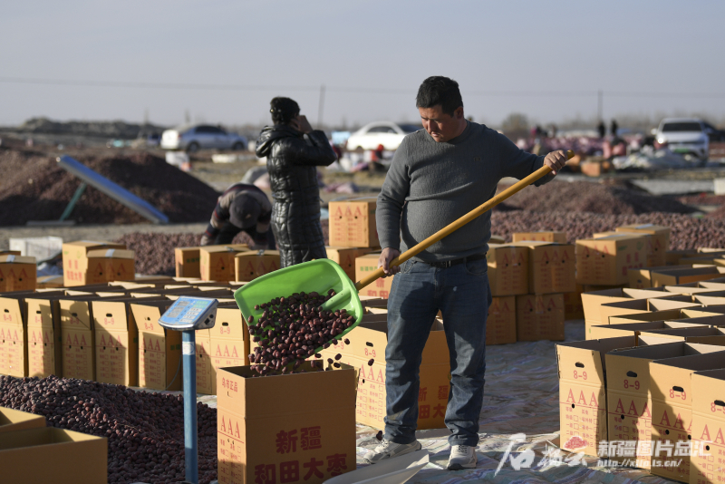 11月29日,農(nóng)民在晾曬場(chǎng)將晾曬好的紅棗裝箱。