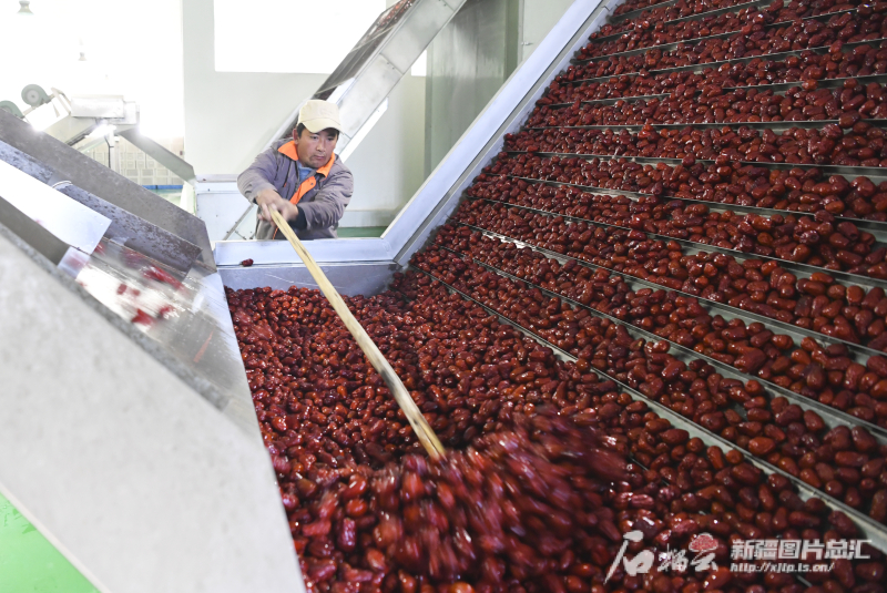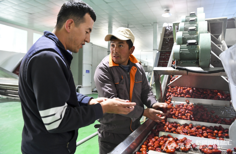11月29日,策勒縣智慧果業(yè)農(nóng)民專(zhuān)業(yè)合作社員工在查看紅棗烘干情況。