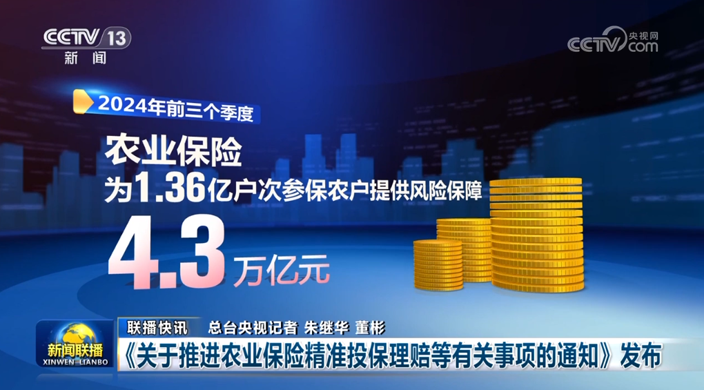 金融監(jiān)管總局等四部門近日聯(lián)合發(fā)布通知,對農(nóng)業(yè)保險投保理賠、應(yīng)收保費(fèi)、條款費(fèi)率、數(shù)據(jù)共享等提出要求,進(jìn)一步提高投保理賠精準(zhǔn)性,推動我國農(nóng)業(yè)保險高質(zhì)量發(fā)展。今年前三個季度,農(nóng)業(yè)保險為1.36億戶次參保農(nóng)戶提供風(fēng)險保障4.3萬億元。
