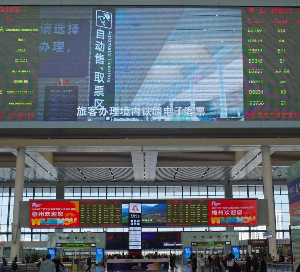 12月1日,在廣西南寧市南寧東站,記者看到車(chē)站大屏幕上,鐵路電子客票服務(wù)宣傳片正在滾動(dòng)播放。