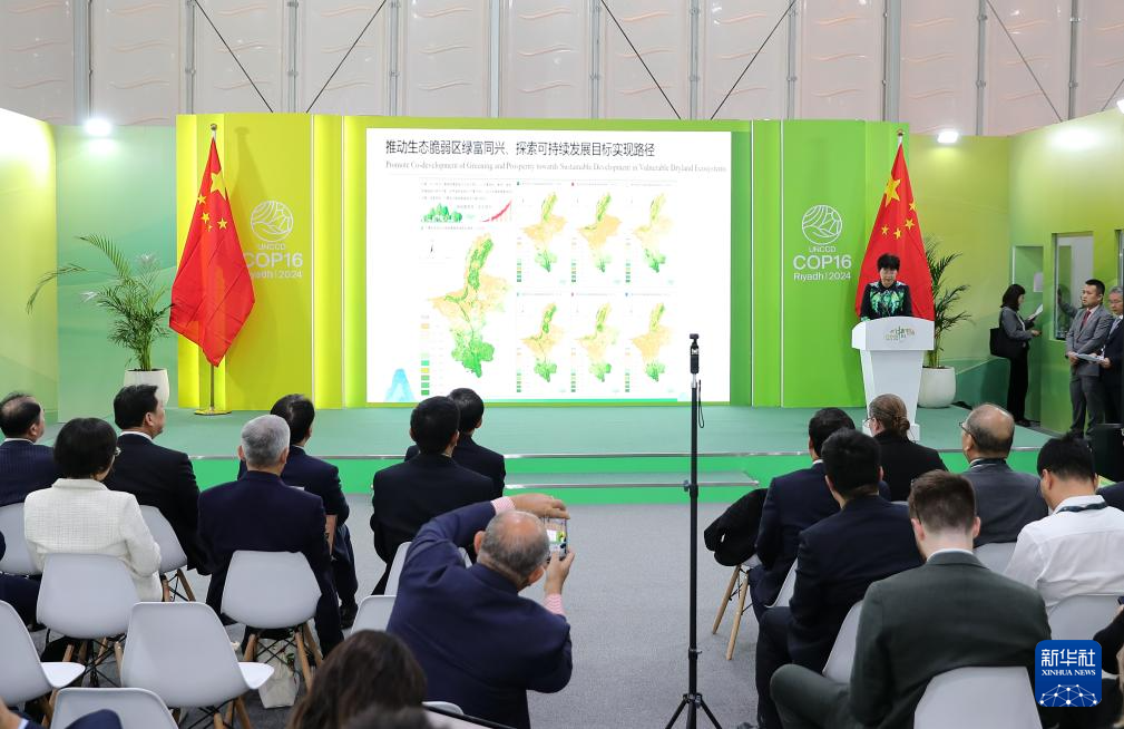 這是12月4日在沙特阿拉伯利雅得《聯(lián)合國(guó)防治荒漠化公約》第十六次締約方大會(huì)(COP16)中國(guó)館拍攝的邊會(huì)現(xiàn)場(chǎng)?!堵?lián)合國(guó)防治荒漠化公約》第十六次締約方大會(huì)(COP16)中國(guó)館4日下午舉辦首場(chǎng)邊會(huì),向全球介紹荒漠化防治的“寧夏經(jīng)驗(yàn)”。新華社記者 王東震 攝