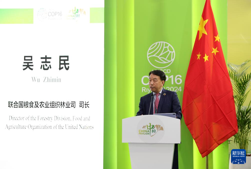 12月4日,在沙特阿拉伯利雅得,聯(lián)合國(guó)糧食及農(nóng)業(yè)組織林業(yè)司司長(zhǎng)吳志民在《聯(lián)合國(guó)防治荒漠化公約》第十六次締約方大會(huì)(COP16)中國(guó)館舉辦的邊會(huì)上發(fā)言。新華社記者 王東震 攝