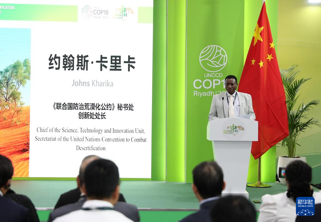 12月4日,在沙特阿拉伯利雅得《聯(lián)合國(guó)防治荒漠化公約》第十六次締約方大會(huì)(COP16)中國(guó)館,《公約》秘書處創(chuàng)新處處長(zhǎng)約翰斯·卡里卡在邊會(huì)上發(fā)言。新華社記者 王東震 攝