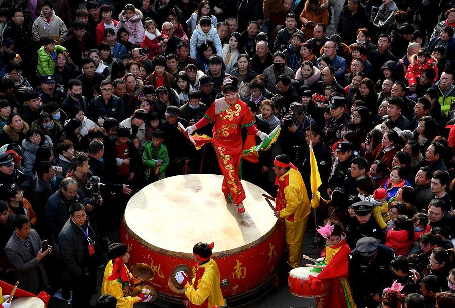 2018年3月2日,一支鑼鼓隊(duì)在河南??h古廟會上表演。 新華社記者 李安 攝