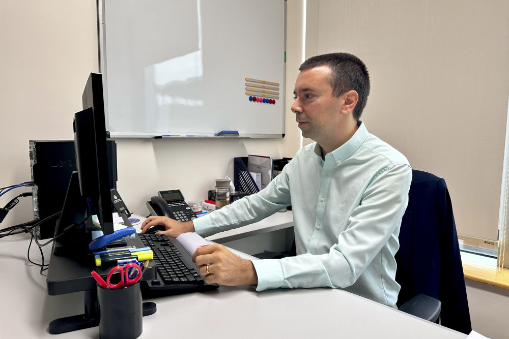 2024年11月21日,澳門城市大學葡語國家研究院的助理教授、來自葡萄牙的若昂·西蒙斯(中文名朱奧)在辦工室工作。新華社記者 王露 攝