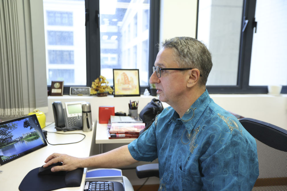 2024年11月14日,澳門大學社會科學學院副教授、來自美國的托德·萊爾·桑德爾(中文名申大德)在辦公室工作。新華社記者 梁家駿 攝