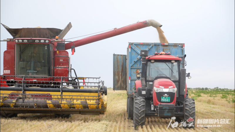 6月5日,喀什地區(qū)麥蓋提縣新疆五征綠色農(nóng)業(yè)發(fā)展有限公司在塔克拉瑪干沙漠邊緣種植的6000余畝冬小麥收獲場景(資料圖)。買熱古·買買提攝
