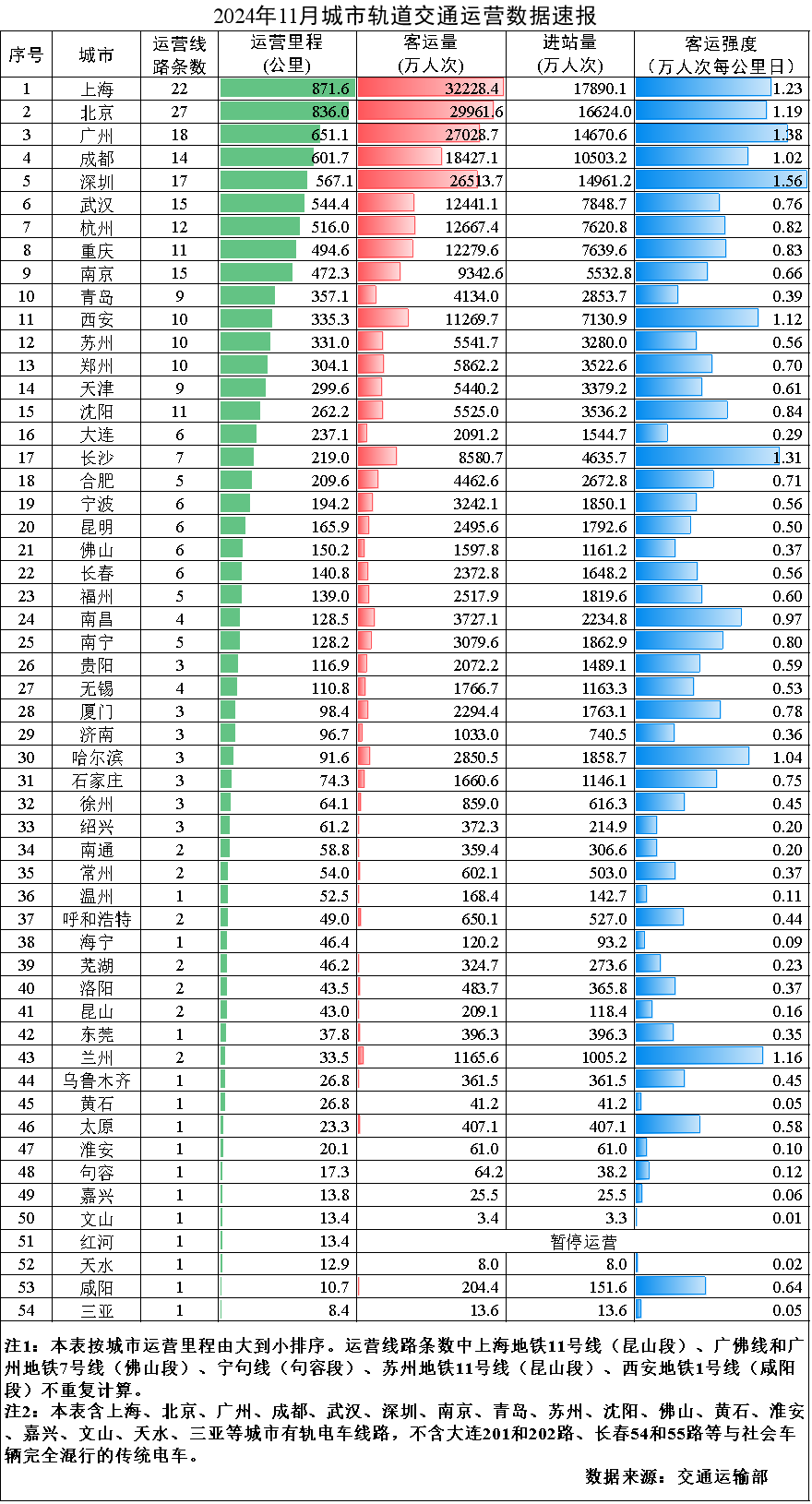 交通運(yùn)輸部發(fā)布消息,2024年11月,31個(gè)省(自治區(qū)、直轄市)和新疆生產(chǎn)建設(shè)兵團(tuán)共有54個(gè)城市開(kāi)通運(yùn)營(yíng)城市軌道交通線路313條,運(yùn)營(yíng)里程10522.1公里,實(shí)際開(kāi)行列車340萬(wàn)列次,完成客運(yùn)量27.1億人次,進(jìn)站量16.2億人次。11月份,客運(yùn)量環(huán)比減少0.6億人次,降低2.2%,同比增加1.3億人次,增長(zhǎng)5.2%。11月份全國(guó)總運(yùn)營(yíng)里程的平均客運(yùn)強(qiáng)度為0.860萬(wàn)人次每公里日,環(huán)比增長(zhǎng)0.8%,同比增長(zhǎng)1.9%。