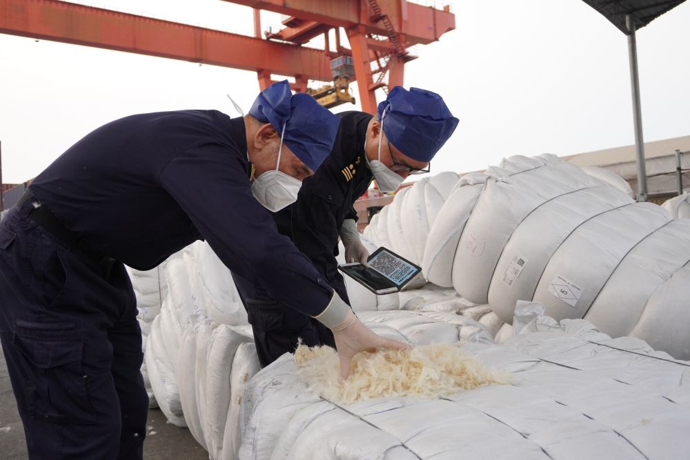 海關(guān)工作人員正在對水洗羽毛羽絨進(jìn)行檢查。新華社發(fā)