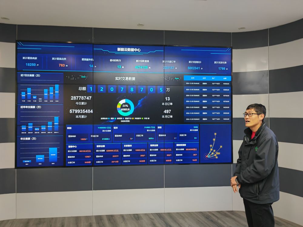 在子牙經開區(qū)的“新能云數(shù)據(jù)中心”,巨大電子屏幕上實時顯示著新能公司與全國資源回收下游企業(yè)在銅、鋁等方面的訂單。目前,平臺線上交易商家已達18000余戶,輻射全國80%地區(qū),近3年累計回收各類再生資源400多萬噸,線上交易額近千億元。