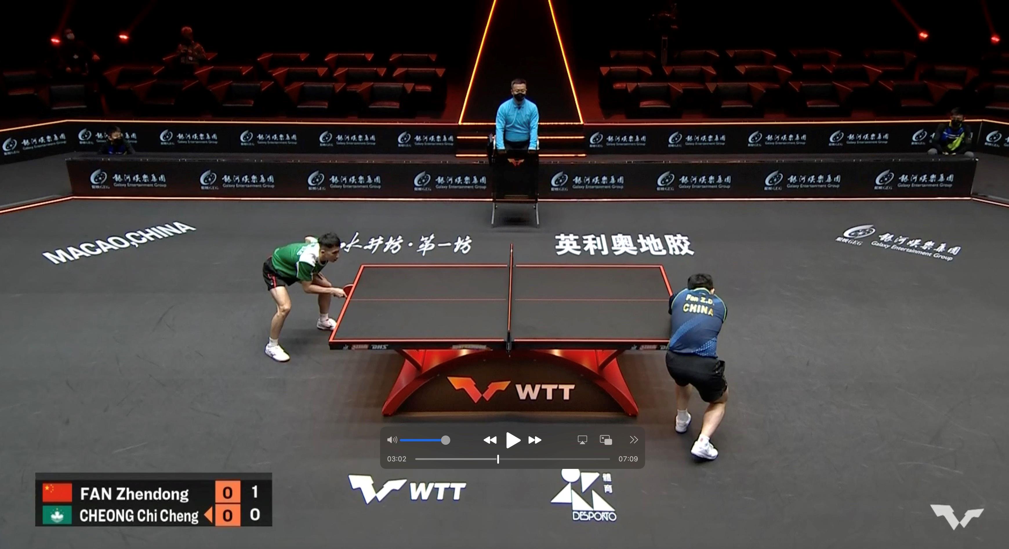 2022年WTT澳門冠軍賽男單八分之一決賽張子澄與樊振東“交手”