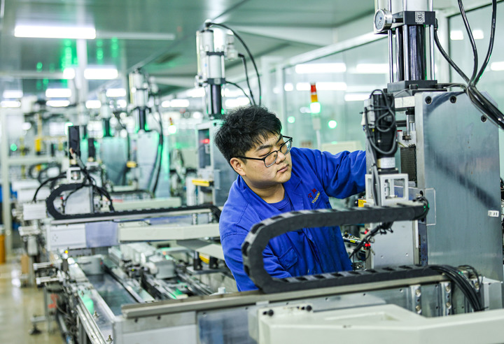 2024年12月12日,在山東省榮成市一家燃氣計量儀表制造企業(yè)的智能化生產(chǎn)車間內(nèi),維修工人在進行設(shè)備調(diào)試。新華社發(fā)(李信君攝)
