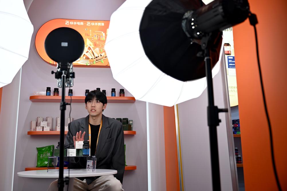 2024年11月5日,快手跨境主播在第七屆進博會服務(wù)貿(mào)易展區(qū)直播。新華社發(fā)(陳浩明攝)