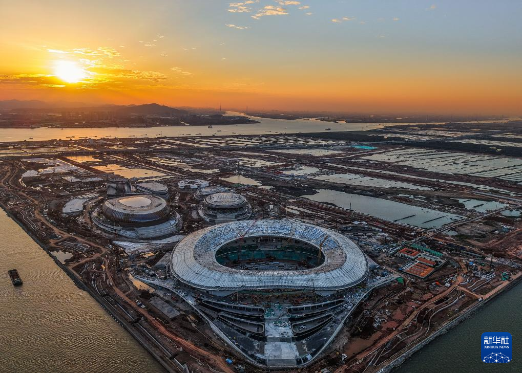 位于粵港澳大灣區(qū)“地理幾何中心”的廣州南沙全民文化體育綜合體建設(shè)進展順利(2024年11月27日攝,無人機照片)。