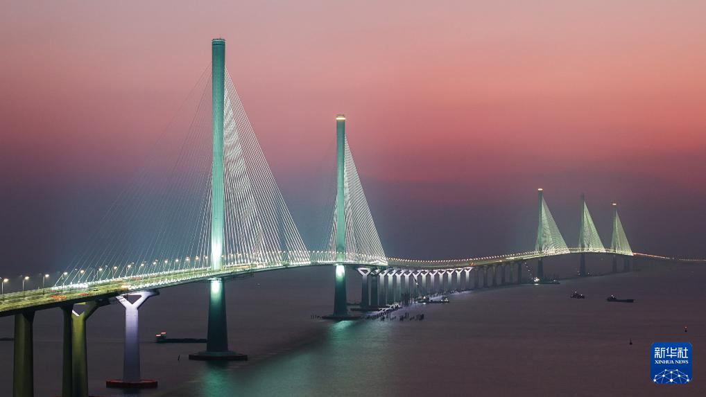 暮色中的黃茅海跨海通道高欄港大橋(左側(cè)雙主塔)和黃茅海大橋(右側(cè)三主塔)(2024年12月7日攝,無人機照片)。