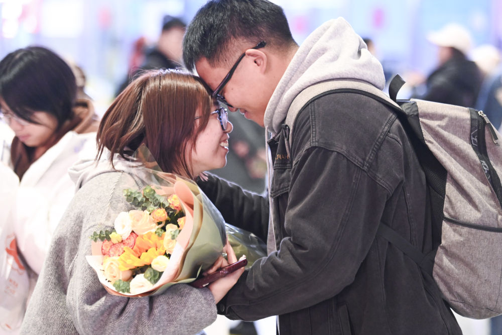 2月5日,在廣西柳州站出站口,一名接站者與剛出站的女朋友碰頭互動。