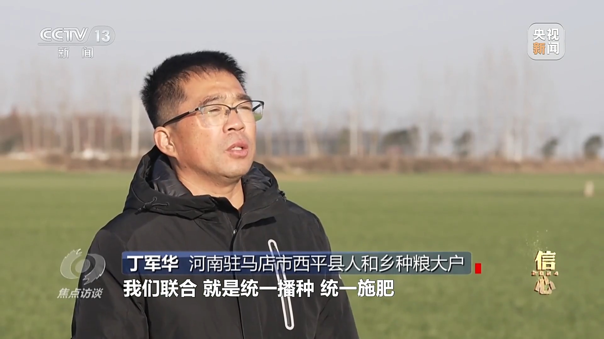 河南駐馬店市西平縣仁和鄉(xiāng)種糧大戶 丁軍華:“我們聯(lián)合就是統(tǒng)一播種、統(tǒng)一施肥、統(tǒng)一管理、統(tǒng)一打藥、統(tǒng)一購銷和統(tǒng)一收割,做到了‘六統(tǒng)一’,共同抱團(tuán)去跟廠家談判、爭取最低的價格。這一次小麥播種,我們從黑龍江引進(jìn)大型氣吸型播種機,地少了它不來,用這種播種機,一畝地比普通播種機增產(chǎn)15%以上?!?/p>
