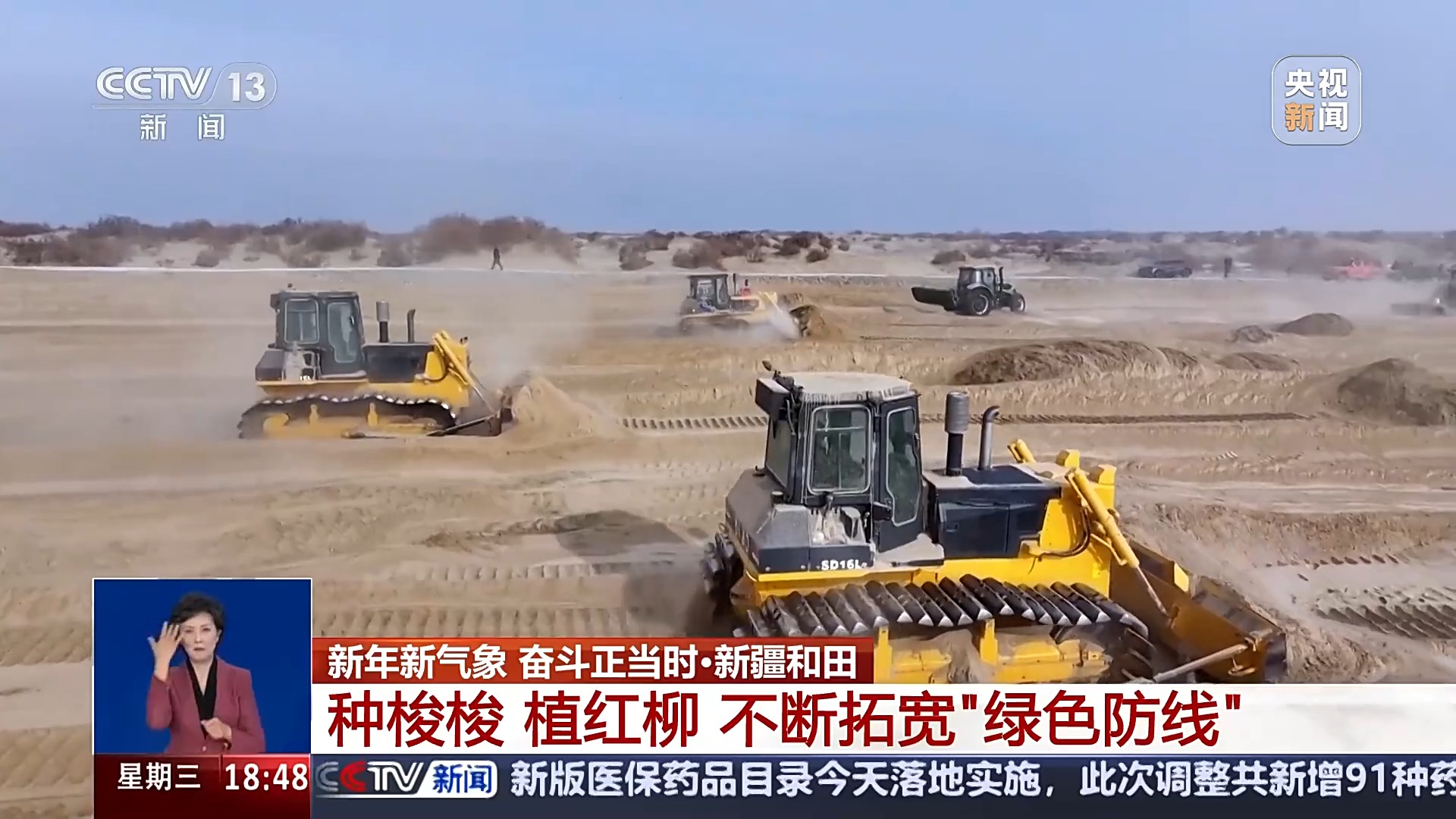 總臺(tái)記者 高鵬飛:這里是塔克拉瑪干沙漠南緣的和田于田縣,這兩天沙漠里面迎來了一場降雪,這會(huì)氣溫在零下10℃左右,非常寒冷,但是,在我旁邊就是一處熱火朝天的沙漠治沙現(xiàn)場。