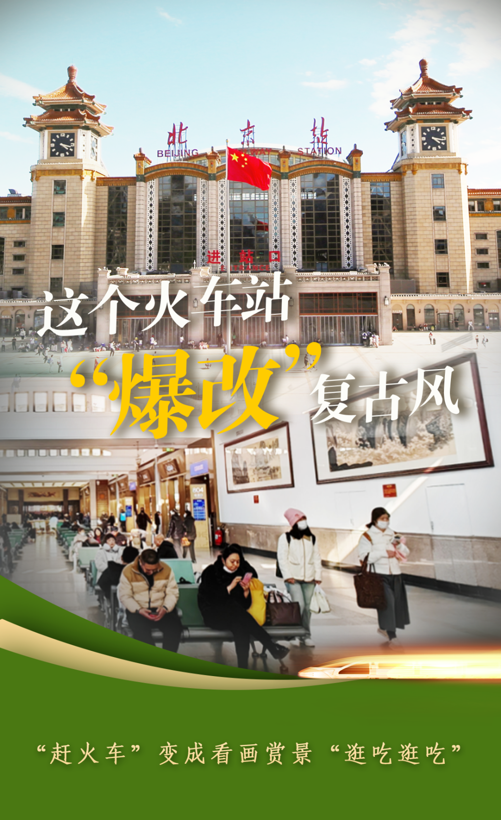 復(fù)古風(fēng)、懷舊風(fēng)盛行的當(dāng)下,連火車(chē)站都在變。1959年建成的北京站,裝修風(fēng)格回到66年前。站房外立面重現(xiàn)主樓歷史風(fēng)貌,候車(chē)室采用建站之初的綠色環(huán)形座椅風(fēng)格,墻上掛起名人字畫(huà)……今年春運(yùn),北京站以更文藝、更復(fù)古的方式迎接南北旅客。