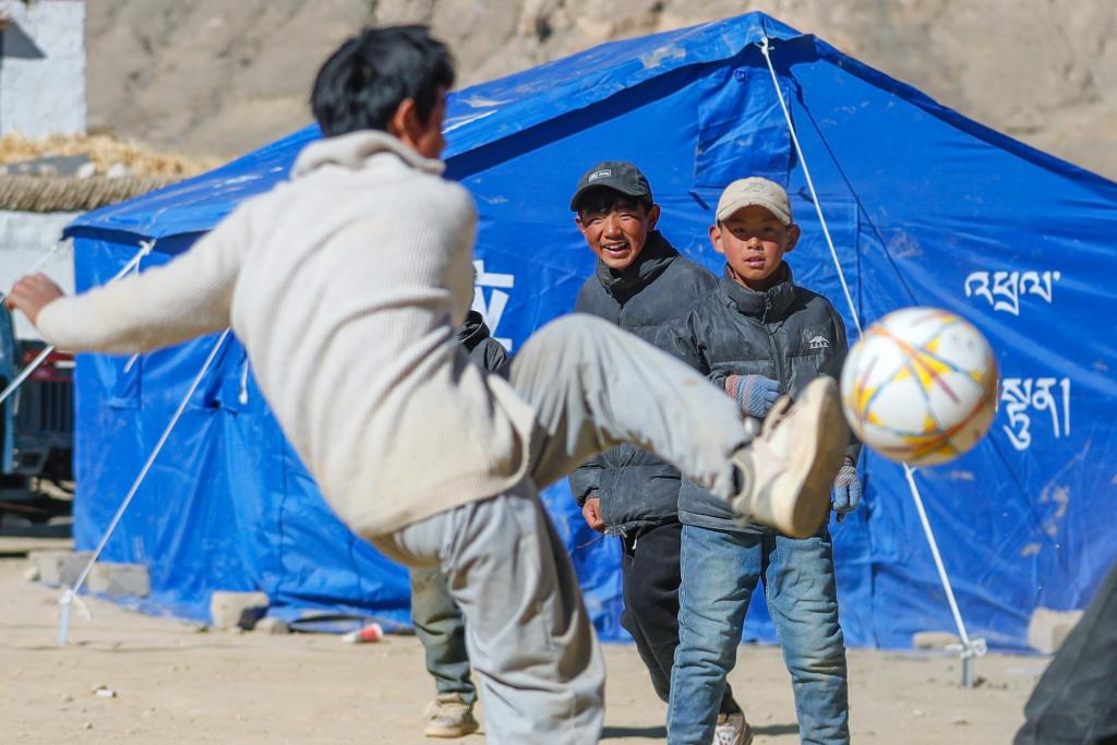 1月11日,在定日縣曲洛鄉(xiāng)措昂村,孩子們在臨時安置帳篷間的空地上踢足球。(新華社記者 沈伯韓 攝)