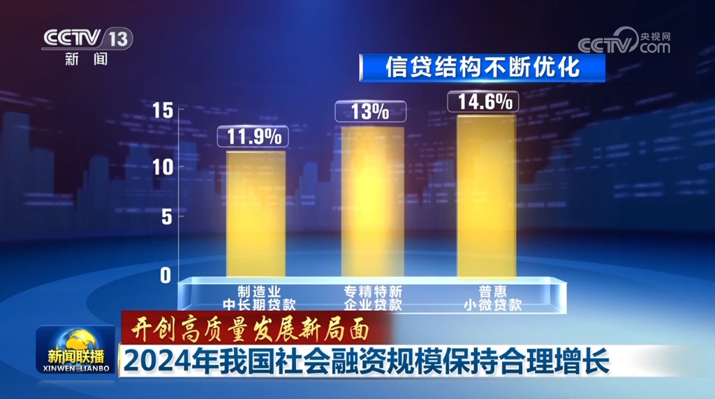 中國人民銀行相關(guān)負(fù)責(zé)人介紹,2024年12月末,社會融資規(guī)模存量為408.34萬億元,其中,對實體經(jīng)濟(jì)發(fā)放的人民幣貸款余額為252.53萬億元,同比增長7.2%。信貸結(jié)構(gòu)不斷優(yōu)化,制造業(yè)中長期貸款、專精特新企業(yè)貸款、普惠小微貸款增長較快,繼續(xù)高于同期全部貸款增速。