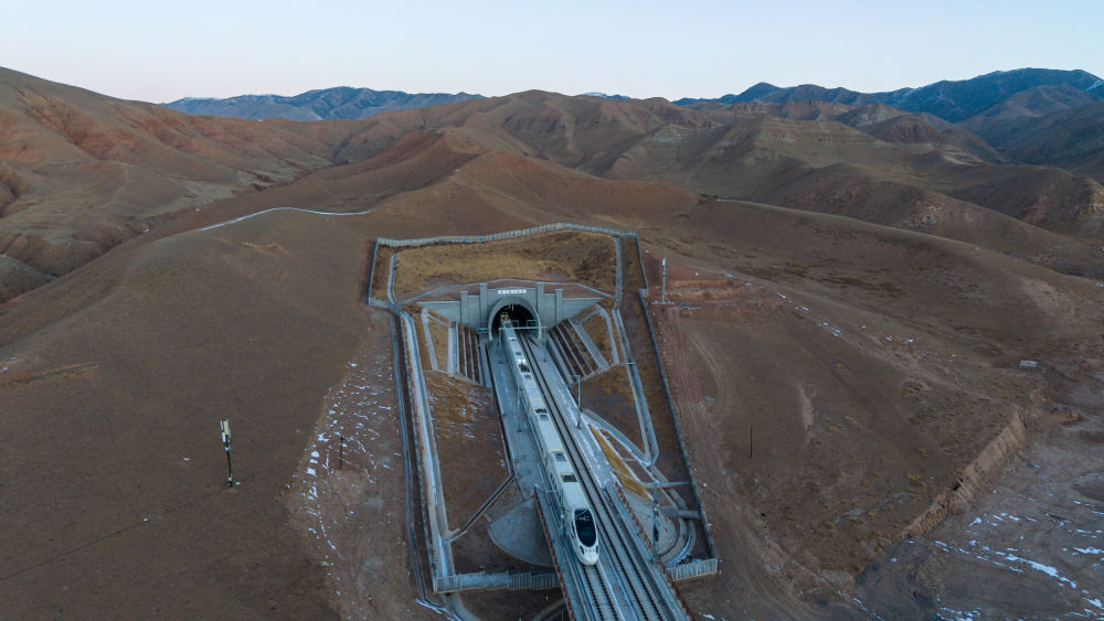 1月14日8時(shí)20分許,蘭州西發(fā)往武威東的D8885次動(dòng)車(chē)組列車(chē)穿過(guò)新烏鞘嶺隧道。這是新烏鞘嶺隧道通車(chē)后迎來(lái)的首列春運(yùn)列車(chē)(無(wú)人機(jī)照片)。新華社記者 郎兵兵 攝