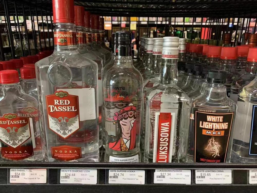 加拿大超市貨架上的中國產(chǎn)國粹臉譜系列伏特加。受訪者供圖
