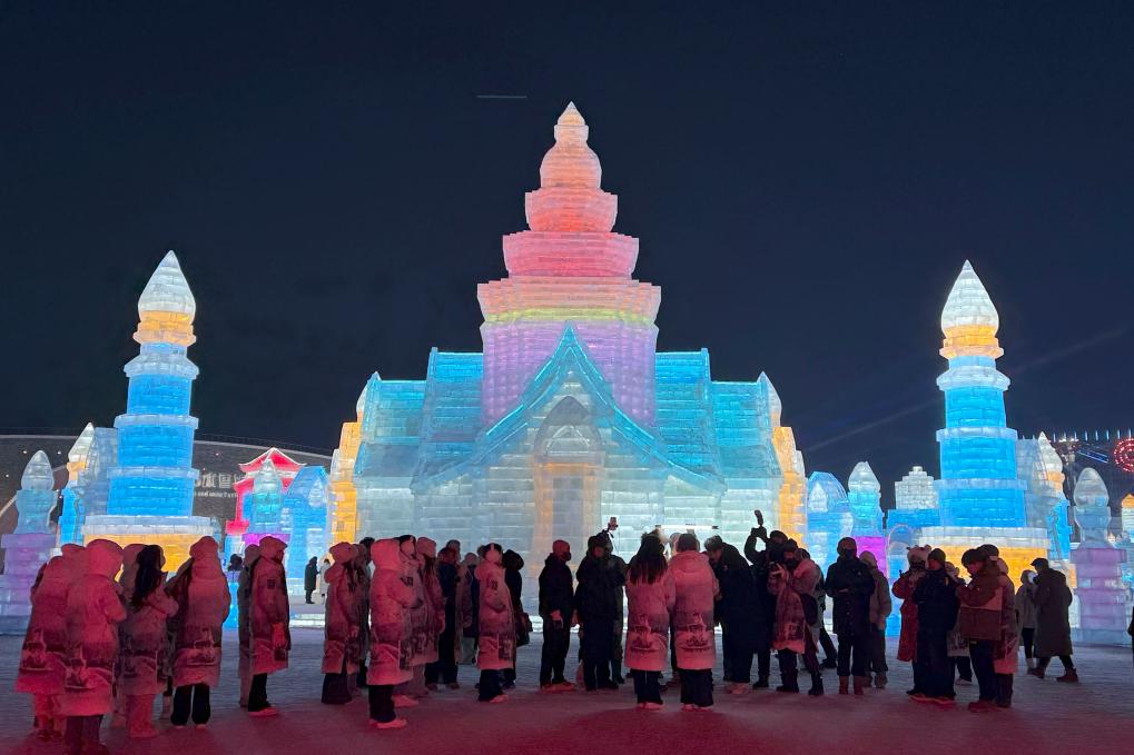 2024年12月26日,游客在哈爾濱冰雪大世界園區(qū)內拍照游玩。新華社記者楊思琪 攝