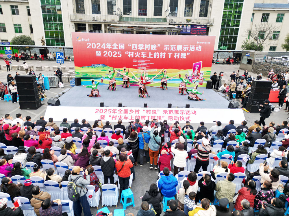 新鮮的農(nóng)產(chǎn)品、喜慶的車廂、特色的民族歌舞、精美的非遺展示……1月18日,2025年全國鄉(xiāng)村“村晚”示范展示活動(dòng)暨“村火車上的村T村晚”啟動(dòng)儀式,在貴陽開往玉屏的5640次“慢火車”上舉行。
