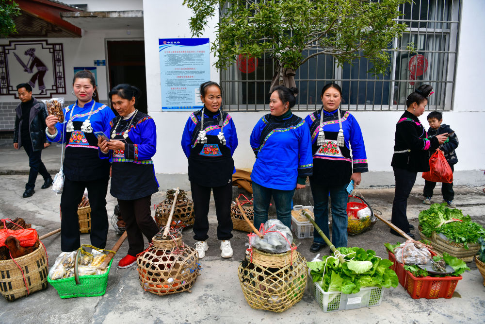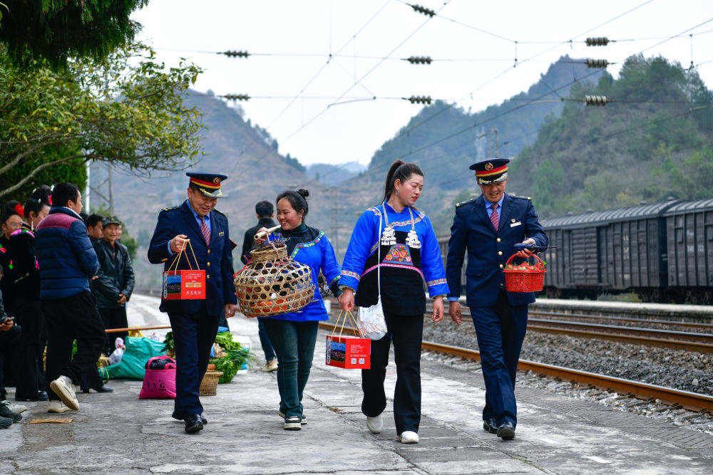 1月18日,在滬昆鐵路六個(gè)雞火車站,鐵路工作人員與村民交流當(dāng)天售賣的農(nóng)產(chǎn)品情況。新華社記者 楊文斌 攝