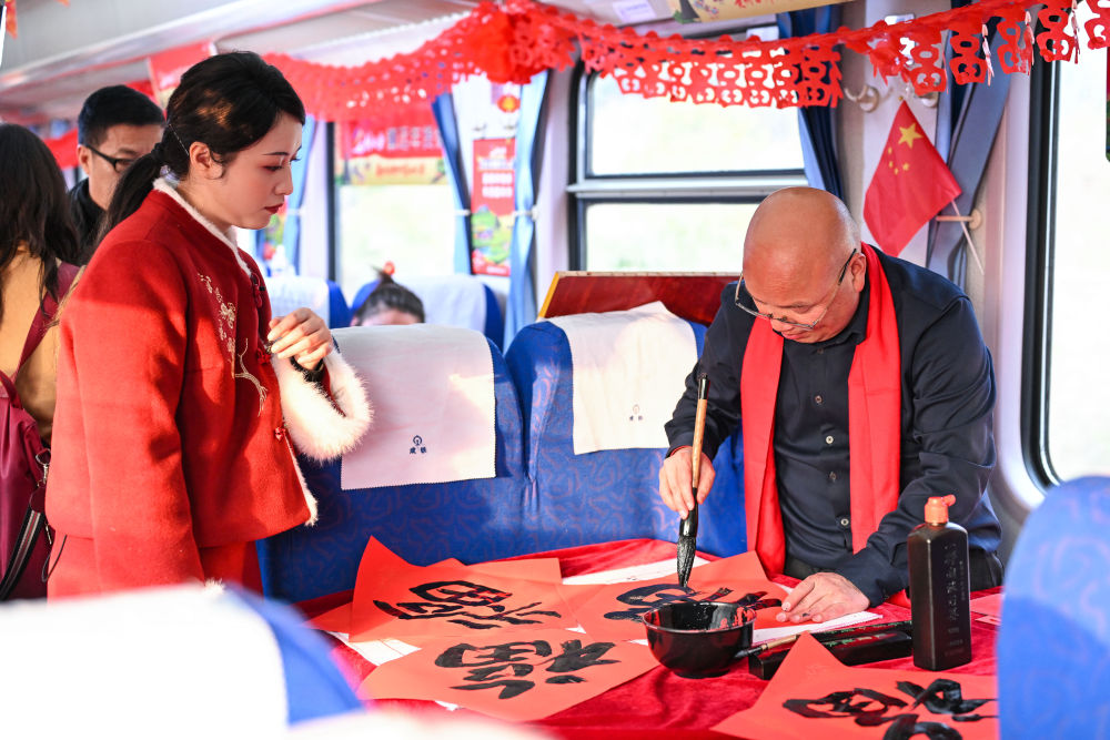 1月18日,書法家在5640次列車上給乘客書寫福字。新華社記者 楊文斌 攝