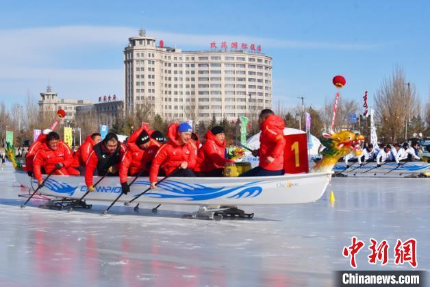 1月20日,內(nèi)蒙古盛世柳蘭代表隊代表中國參加錫林郭勒國際冰上龍舟錦標(biāo)賽。孫沐野攝