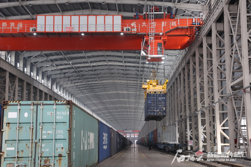 “轟隆轟隆……”室內(nèi),一列列裝滿貨物的列車,從阿拉山口站集裝箱換裝庫有序地駛進又駛出。