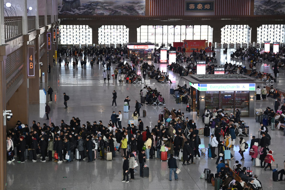 在西安站候車(chē)大廳,旅客排隊(duì)檢票乘車(chē)。新華社記者 李一博 攝