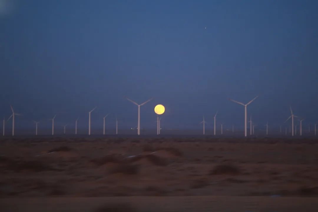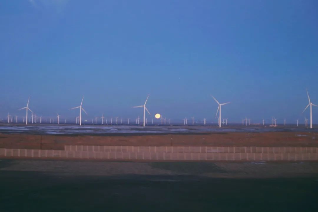 在前往家鄉(xiāng)的列車(chē)上經(jīng)過(guò)哈密時(shí),我坐在窗邊正吃著泡面,抬頭便看到這絕美月色,我用相機(jī)將它定格,而在車(chē)廂的另一邊是落日,兩種景色交匯在此,也應(yīng)了窗貼上這句“回家的路,就是最美的風(fēng)景”。