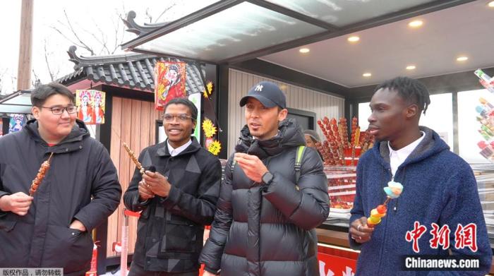 來(lái)自北京工業(yè)大學(xué)的四位留學(xué)生在北京通州大運(yùn)河新春游園會(huì)上品嘗冰糖葫蘆。中新網(wǎng) 林勐男 攝