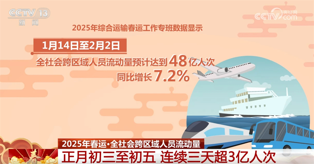 來自2025年綜合運輸春運工作專班數據顯示:1月14日至2月2日,全社會跨區(qū)域人員流動量預計達到48億人次,同比增長7.2%;正月初三、初四、初五已連續(xù)三天超3億人次,均超去年同期水平。