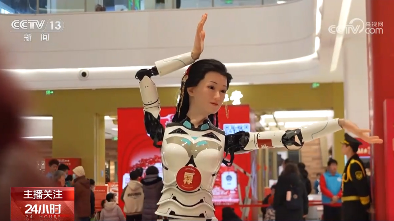 春節(jié)期間,浙江嘉興烏鎮(zhèn)景區(qū)內(nèi),機(jī)器人與小朋友握手互動(dòng),還有機(jī)器人拜年表演,也吸引民眾感受智慧烏鎮(zhèn)的科技年味。