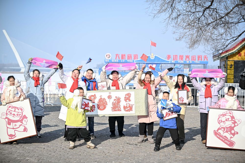 啦啦操、快閃合唱、街頭器樂(lè)演奏、國(guó)標(biāo)舞、冰雕制作……沿途,豐富多彩的群眾活動(dòng)營(yíng)造出滿(mǎn)滿(mǎn)氛圍感。在五星紅旗的掩映下,濱洲鐵路橋煥然一新,高校大學(xué)生置身大型亞冬會(huì)主題畫(huà)框,合唱《我和我的祖國(guó)》,留下精彩一瞬。