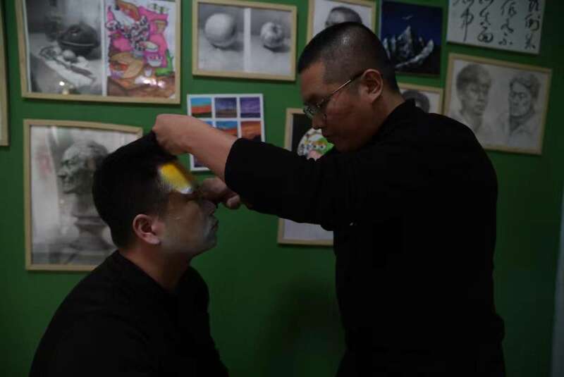 每次演出前,李曉濤要“擇臉”,決定哪張臉化哪個妝,臉大的演員有優(yōu)勢,承得下更復(fù)雜更多細(xì)節(jié)的妝容;額頭高的人可以畫上半張臉細(xì)節(jié)更多的“三塊瓦”。畫著同一底色的演員表演時不能站在一起,以免觀眾有重復(fù)的感覺。