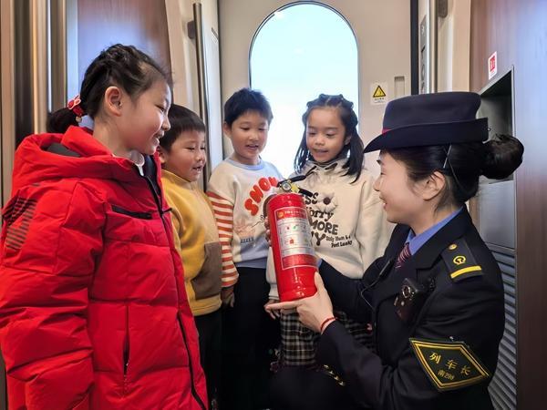 春運期間,南昌客運段組織開展安全乘車小課堂。圖為G1584次列車乘務(wù)員在給小朋友講解列車消防設(shè)備設(shè)施的使用。王夢婧子/攝