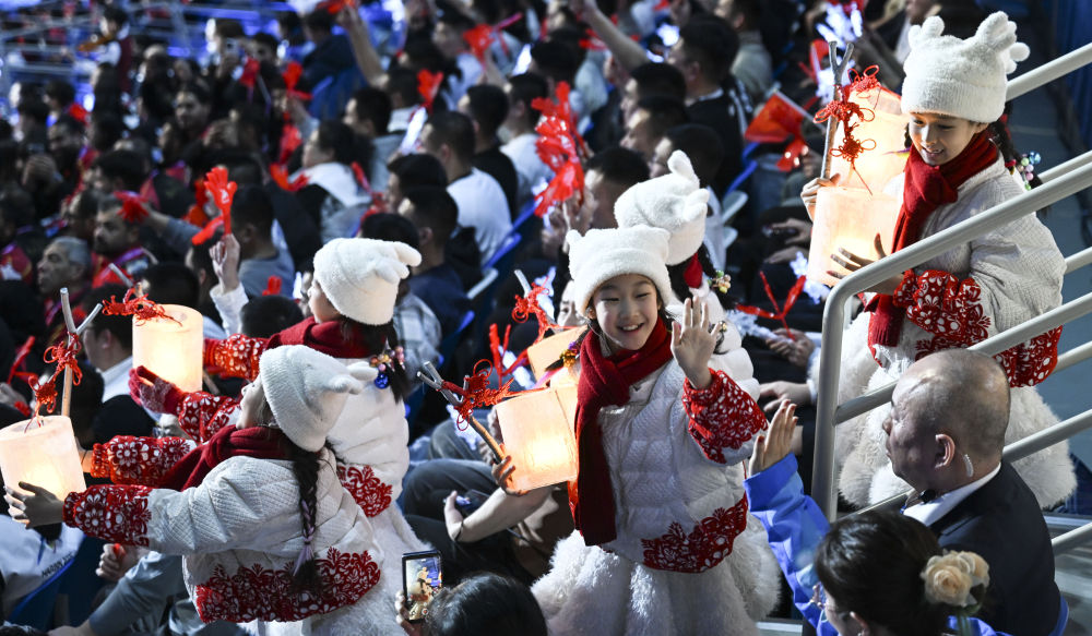 當(dāng)晚,在開幕式分會(huì)場(chǎng)冰雪大世界,手提冰燈的孩子們來(lái)到占地百萬(wàn)平方米的園區(qū),與冠軍火炬手一同滑行,見證主火炬點(diǎn)燃。