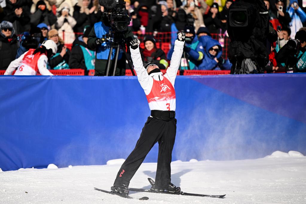 2月9日,徐夢桃在第九屆亞冬會自由式滑雪女子個人空中技巧決賽后慶祝。新華社記者 夏一方 攝