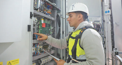 埃及工程師馬哈茂德·穆罕默德正在風(fēng)機內(nèi)部進行電氣檢查。