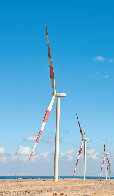 蘇伊士灣風(fēng)電項目位于埃及首都開羅以南約300公里的蘇伊士灣西岸小鎮(zhèn)拉斯·加里卜。項目共有77臺風(fēng)電機組,建成后預(yù)計每年可生產(chǎn)約27億千瓦時的清潔電力,實現(xiàn)二氧化碳減排約100萬噸。穆罕默德說:“在這片曠野上工作,把蘇伊士灣的風(fēng)轉(zhuǎn)化成電能,‘點亮’萬家燈火,我感到十分驕傲?!?/p>